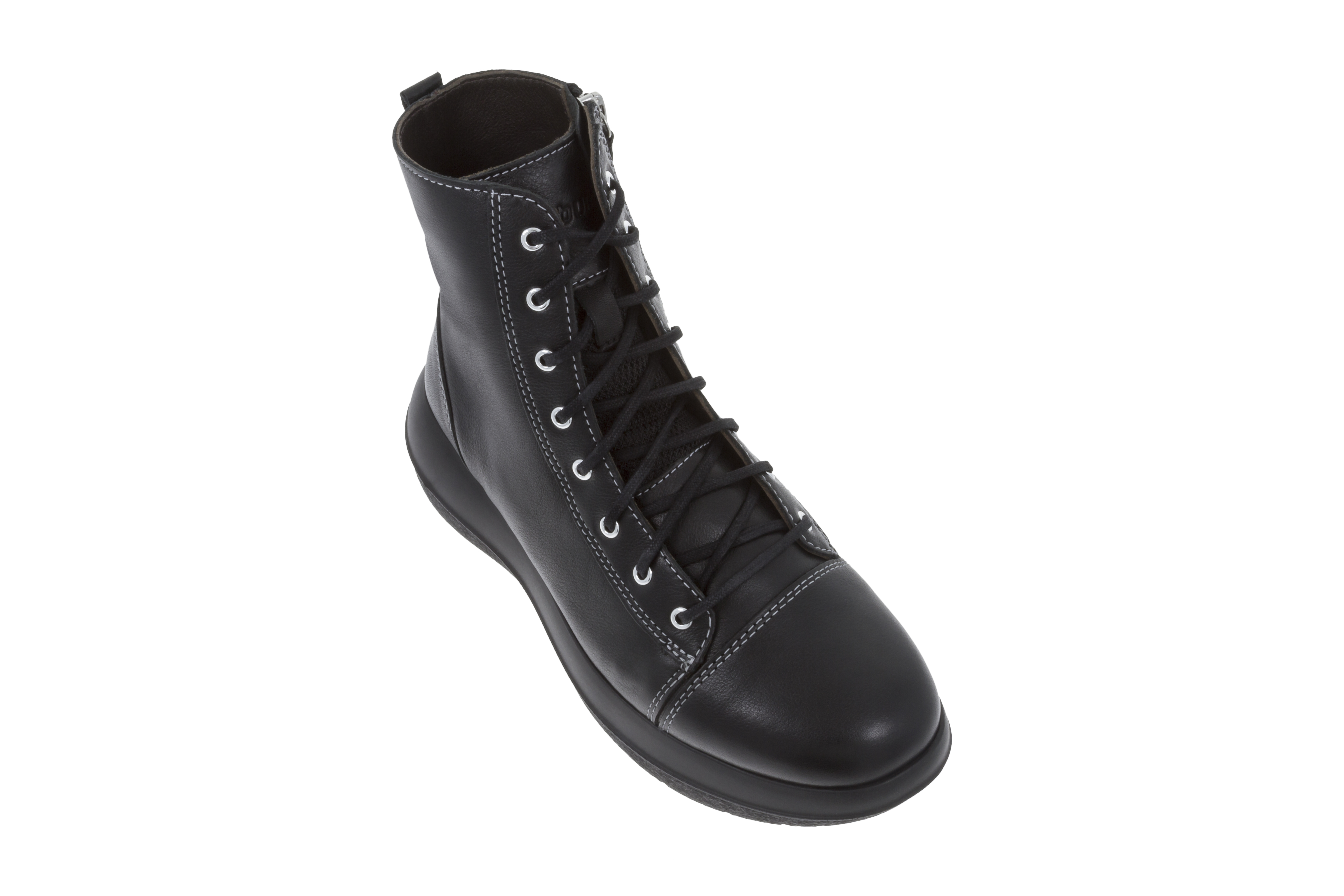 Die Stiefelette kybun Arosa 20 Black präsentiert sich im urbanen Stil. Der abgerundete Schaft, die silbernen Ösen und die Ziernähte unterstreichen diesen Look. Dank der Schnürung ist diese Stiefelette noch individueller an Ihre Fusssituation anpassbar. Durch den Reissverschluss auf der Seite ist ein einfaches An- und Ausziehen gewährleitet. Der kybun Arosa 20 Black passt perfekt in die kältere Jahreszeit, ob für einen Spaziergang oder Stadtbummel: Ihre Füsse sind optimal vor Nässe und Kälte geschützt. Das Modell Arosa 20 Black ist der Nachfolger des Modells Arosa Black und erscheint auf der Strato Sohle.