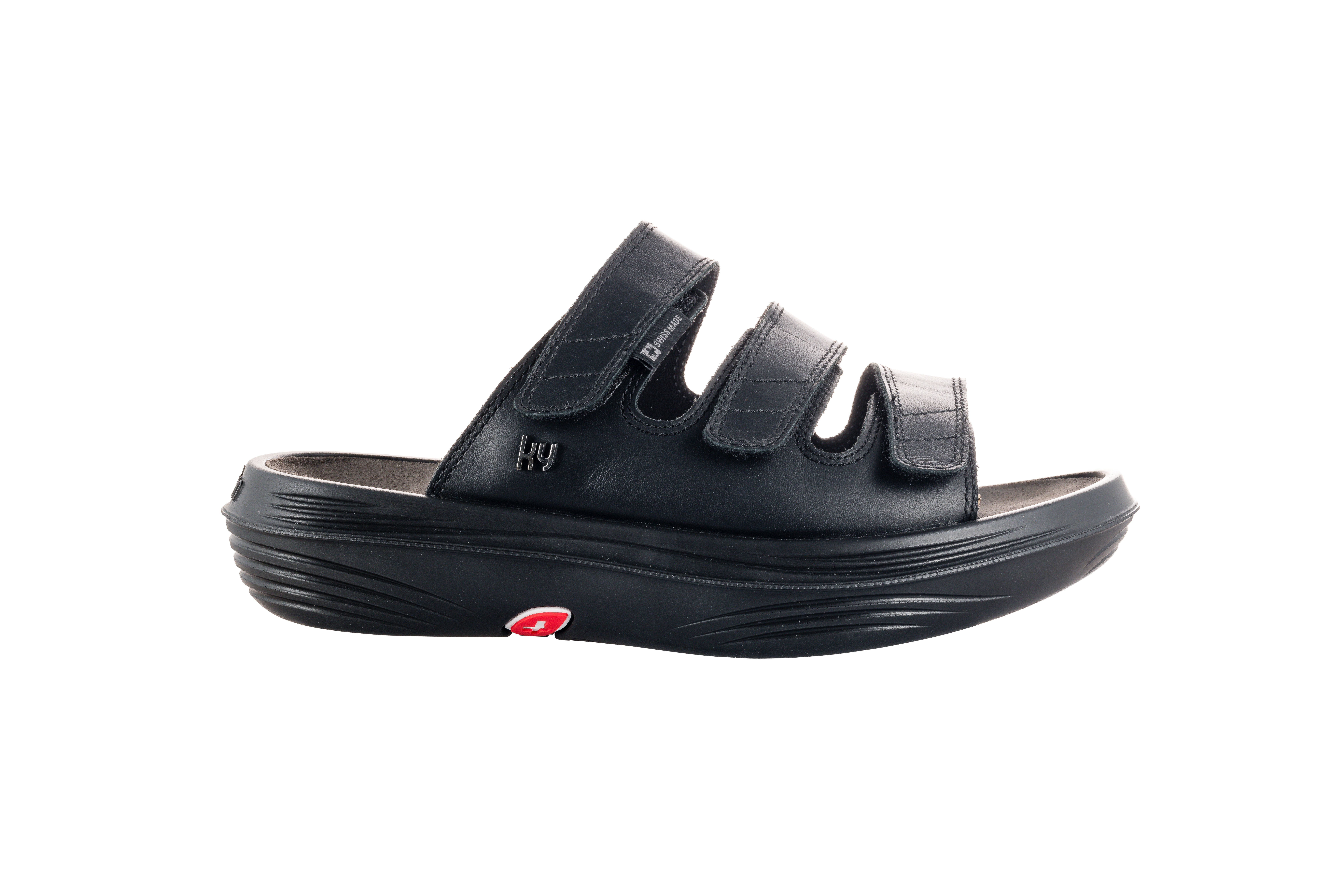 Glatte Vollnarbenleder-Sandale mit drei Klettverschlussriemen, die eine individuelle Passform garantieren. Geschmeidig und bequem, ideal für die Freizeit und besonders für den Gebrauch Zuhause geeignet. Ausgestattet mit unserer einzigartigen Schweizer Luftkissen-Sohle mit starkem Rückfederungseffekt, die ein besonders sanftes Laufgefühl vermittelt, die Gelenke und den Rücken entlastet, die gesundheitsfördernden Rezeptoren in den Füssen stimuliert und die Muskeln bei jedem Schritt stärkt.