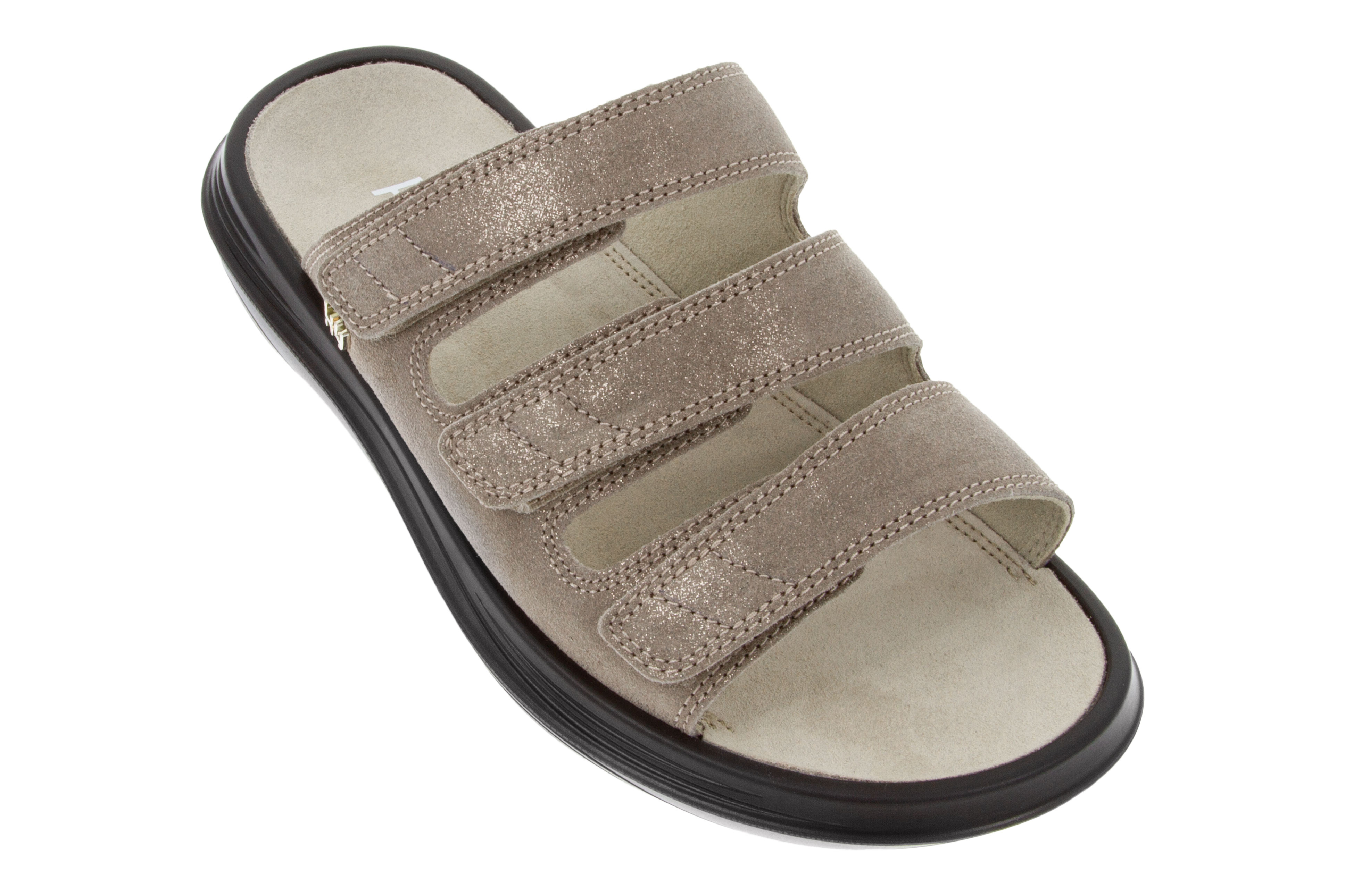 Die Damen-Sandale kybun Kriens Sand Sparkle vereint Urbanität und Trend zugleich. Die Sandale ist als Allrounder für Freizeit und Zuhause gleichermassen passend. Der Oberschuh des Modells Kriens Sand Sparkle erscheint in einem zurückhaltenden Braun. Mit dem leichten Glanz der Oberfläche wird das Modell seinem Namen gerecht. Die luftige Sandale lässt sich durch drei Klettverschlüsse über dem Rist individuell an den Damenfuss anpassen.